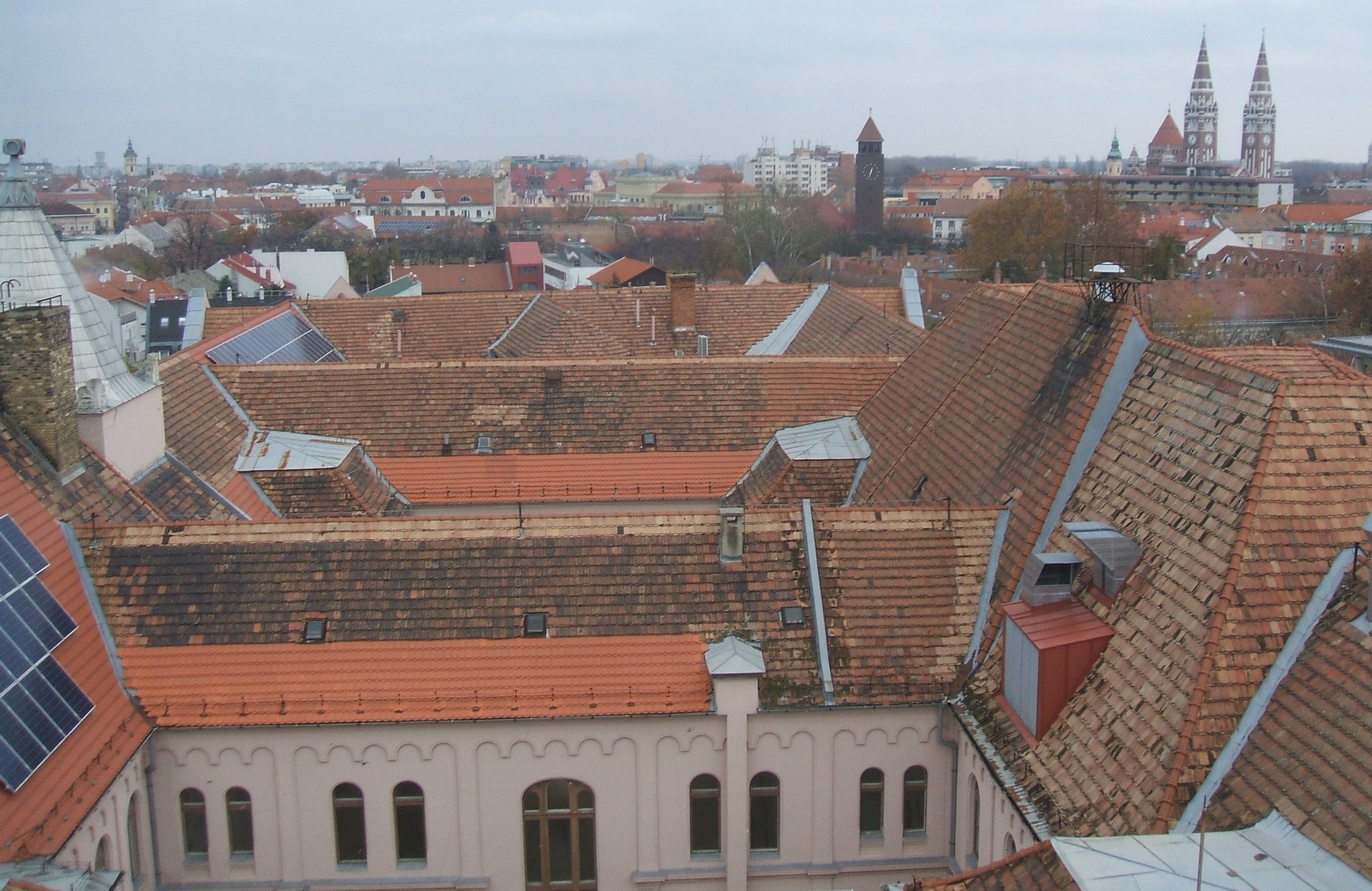 Innen villamossal a Dugonics térre mentünk, ahonnan néhány egyetemi épületet érintve elsétáltunk az Egyetem utcai campusba. Itt találhatók az SZTE földtudományi tanszékei. Az Éghajlattanon Rövid tájékoztatást kaptunk a geográfus és a földrajztanár képzésről. Előtte felmentünk a tetőtéri régi műszerparkba, ahol egy kisebb kilátótoronyból csodálhattuk meg a környéket.